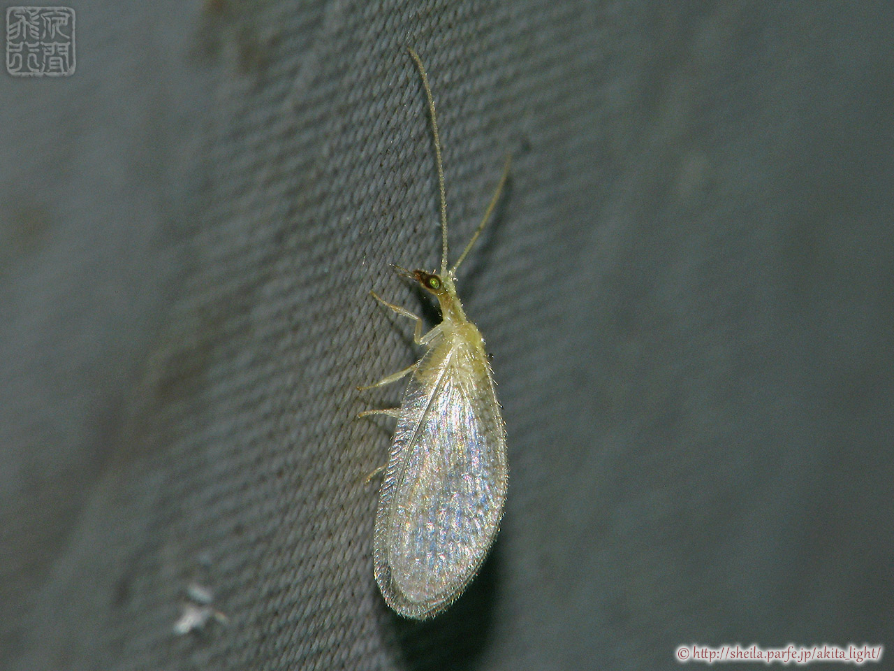 小さめのヒメカゲロウの仲間がライトトラップの白布にとまっていた。羽化したてで色づき前なのか元々このような色なのかはわからないが、特徴もなく種名までは難しい。幼虫は陸生・肉食性で、アブラムシやカイガラムシ、ハダニなどを捕食する。
