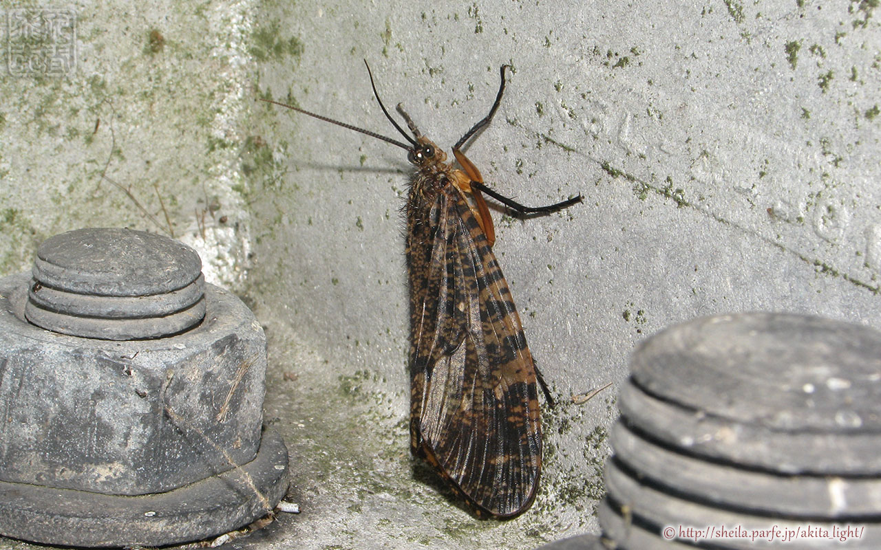 まとまった数が飛来していた。これはほんの一部で白布の縁沿いにたくさんの個体がとまっていた。主に山地の渓流や細流に生息し、灯火には毎年数多く飛来している。