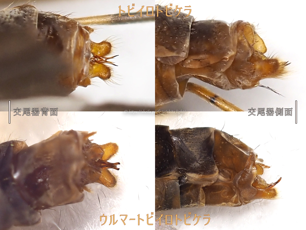 よく似たトビイロトビケラとの交尾器比較図(♂個体)。見る角度によって細部が違って見えたりするが、左右に突出する部分の形状など明確に違いがある。