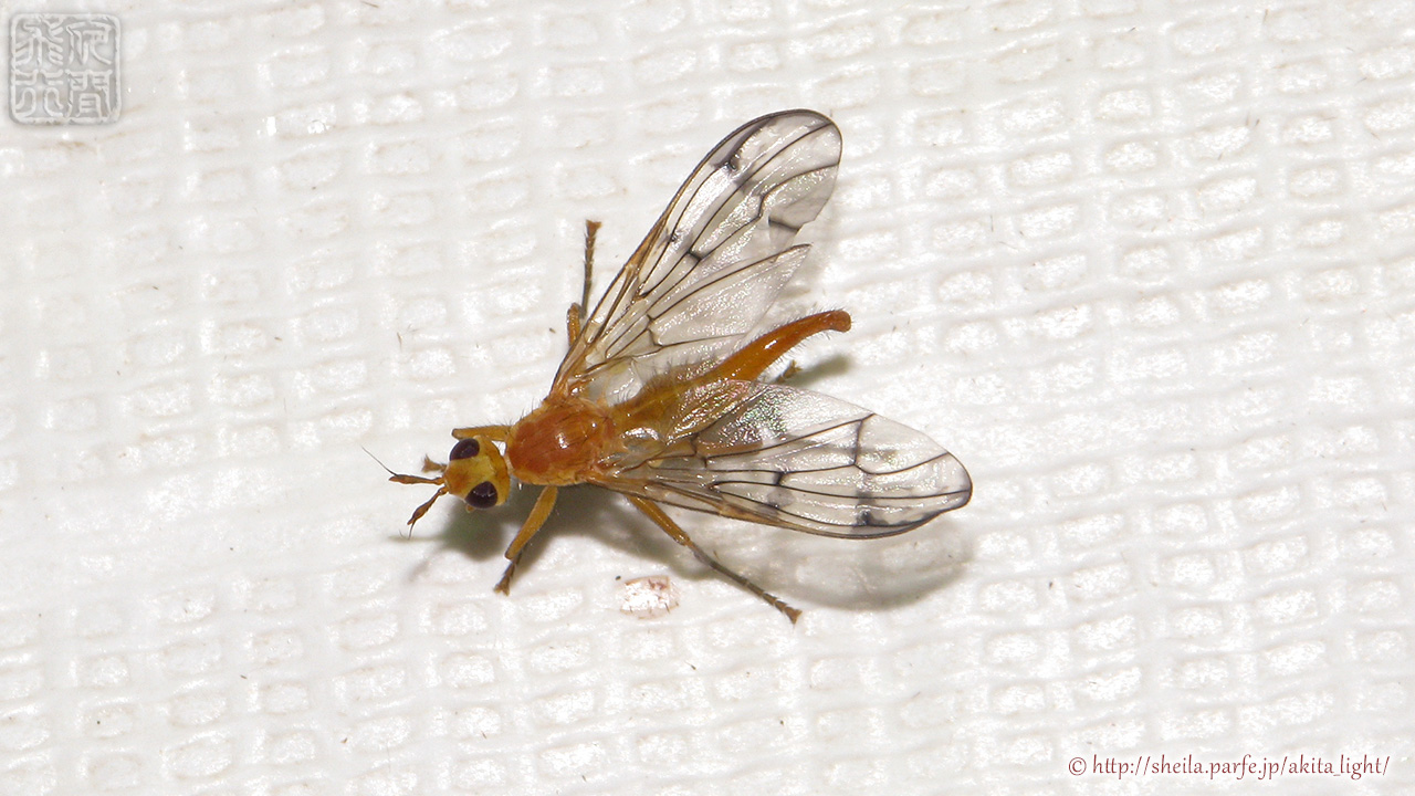 黄橙色のきれいなハエが飛来していた。デガシラバエ科のミツモンハチモドキバエと思われる。腹端から細く伸びるのは産卵管で、下方に曲がった変わった形状になっている。