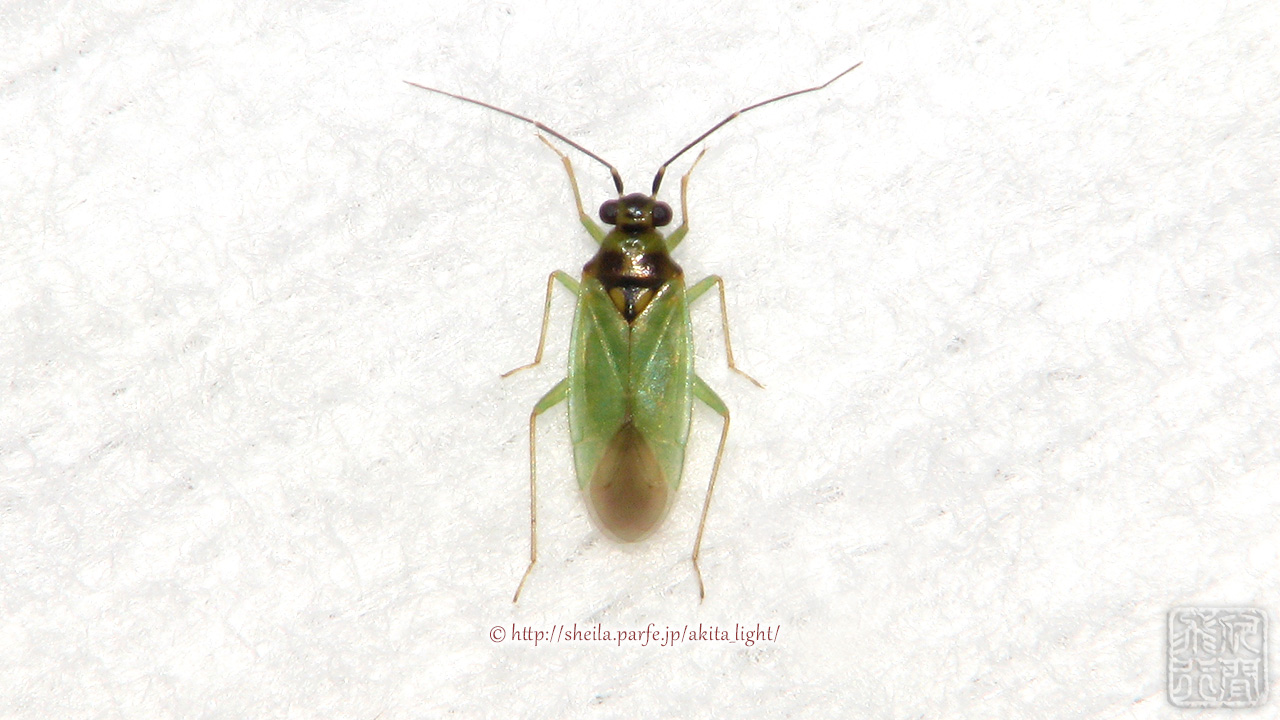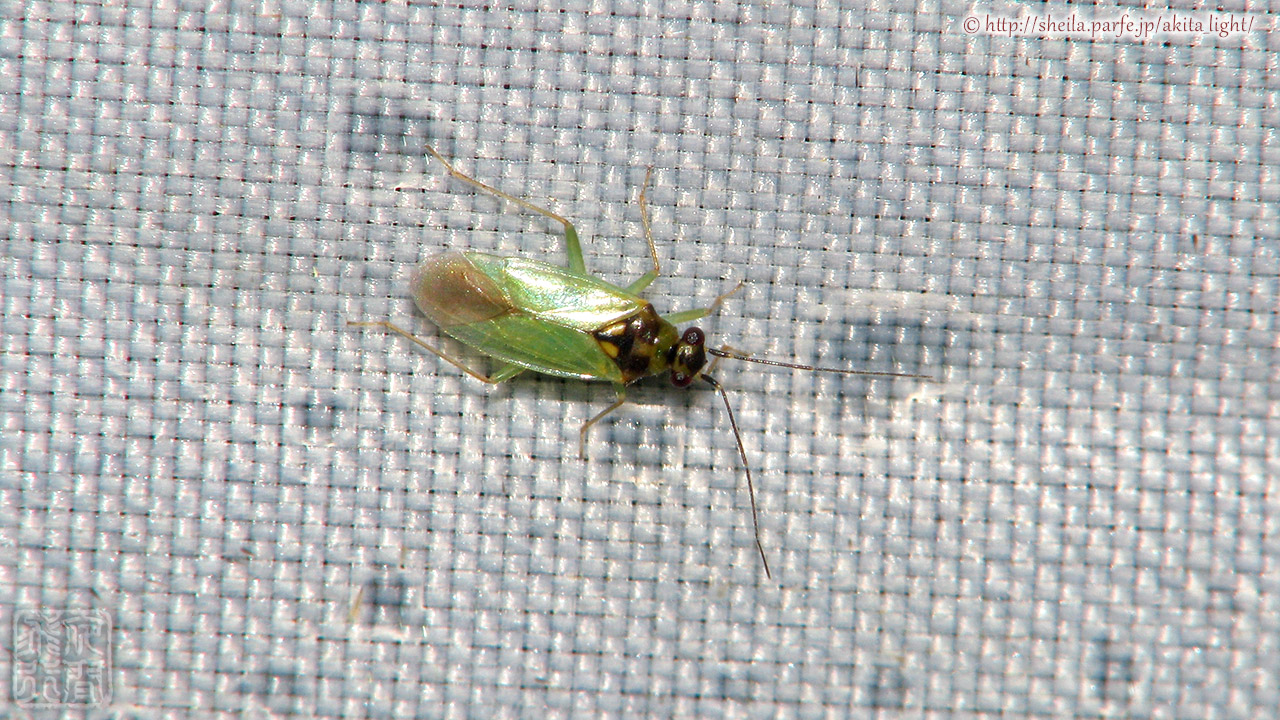 見たいと思っていたカスミカメで嬉しい飛来だった。以前掲載済みのムナグロキイロカスミカメ(Tytthus chinensis)と同様の生態で、餌となるウンカ類とともに長距離移動することが知られている。西日本では普通に見られるらしいが関東以北では稀に見られる程度のようだ。