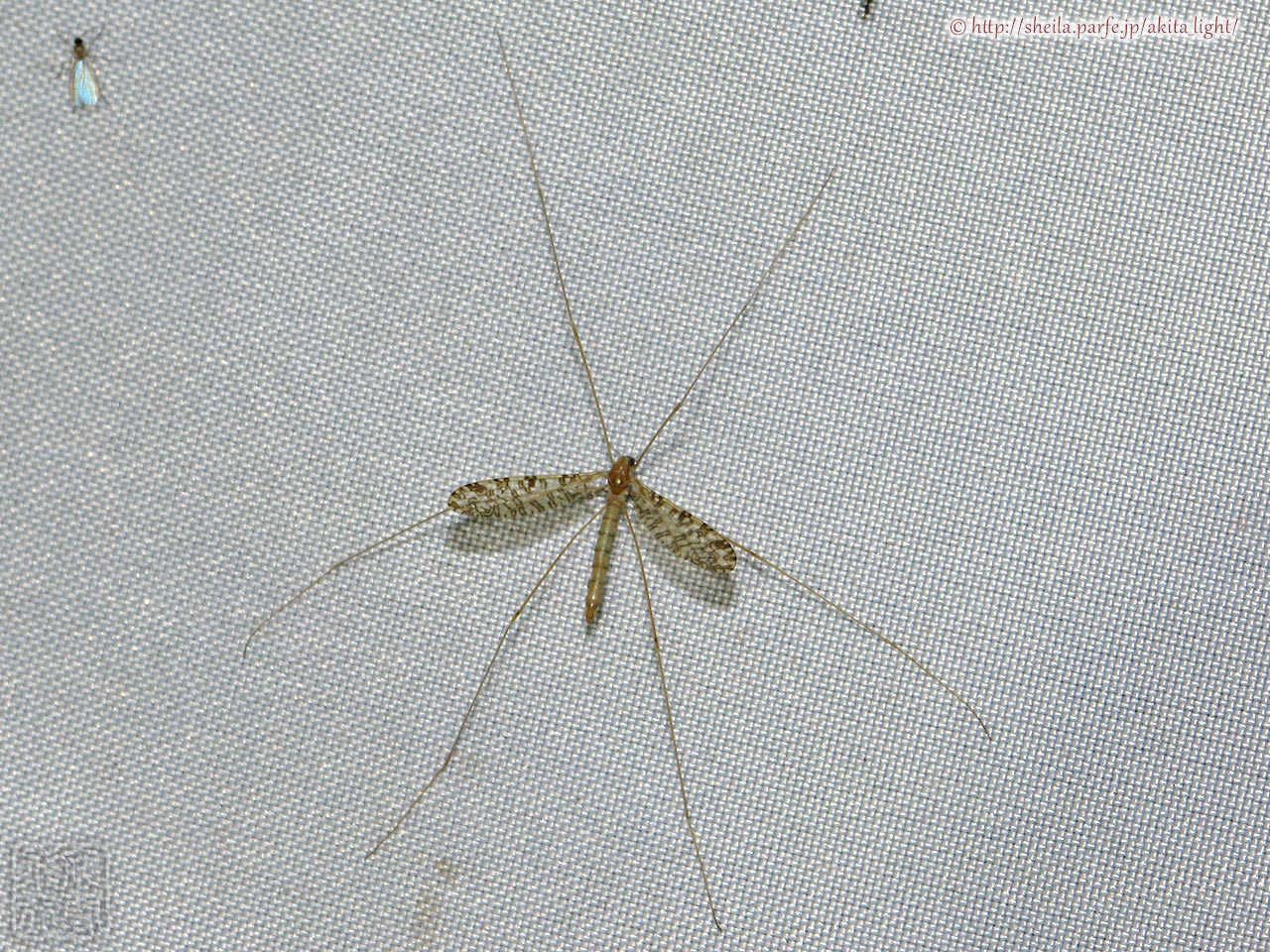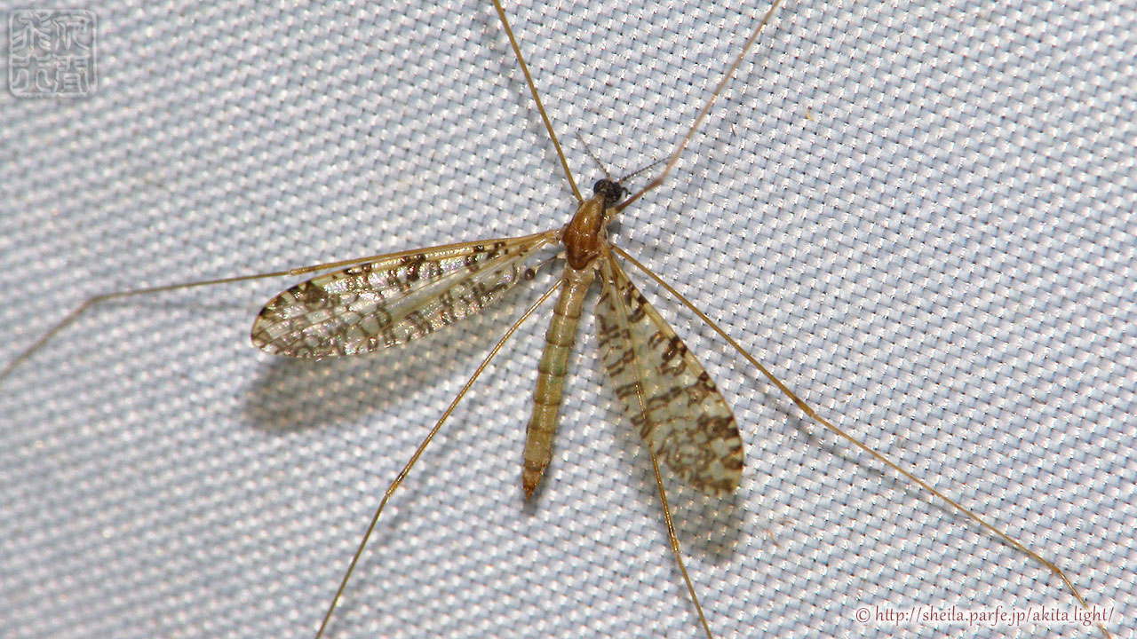 特徴的な斑紋のガガンボが飛来していた。ヒメガガンボ科Discobola属の一種で、おそらく「Discobola margarita」と思われる。翅の斑紋は左右非対称で複雑な模様になっている。