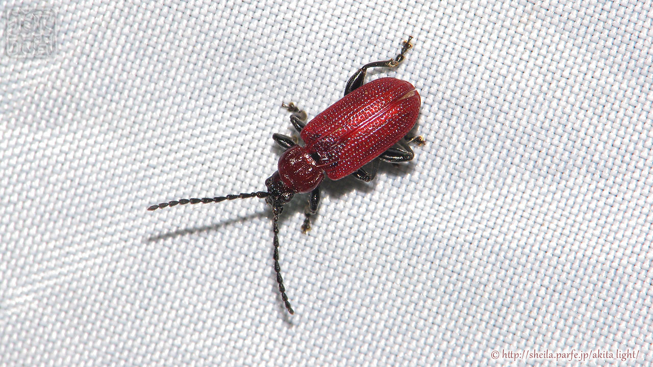 特徴的な赤い色をしたハムシで春~初夏ころに見られる。成虫で越冬しているようで春先の虫というイメージが強い。食草はウバユリ、オニユリ、カタクリなどのユリ科。とくにウバユリ(オオウバユリ)に多く見られる。灯火下ではあまり見た記憶はない。