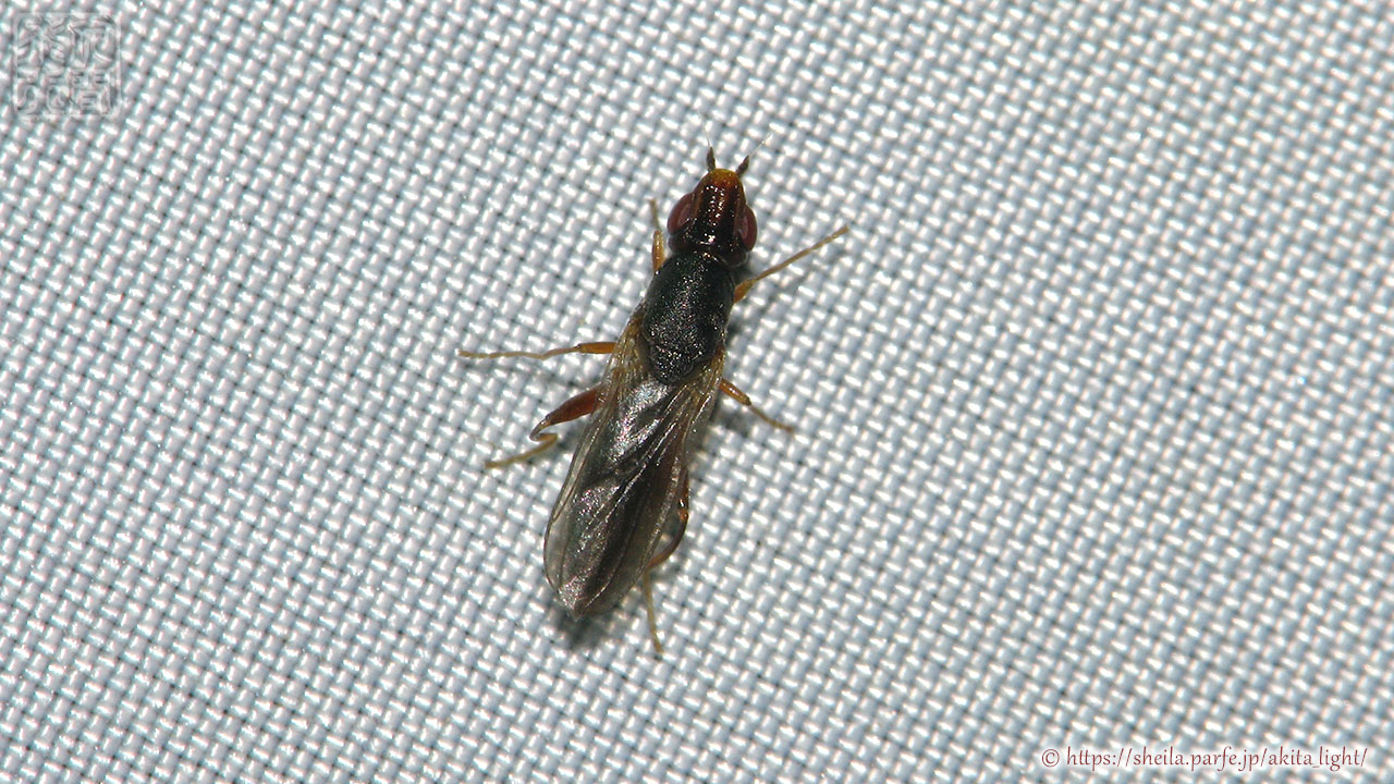細い体型と扁平な頭部をした特徴的なキモグリバエの一種。ササノアシブトキモグリバエ(P. sasae)が近そうではあったが、確定できる資料がないため「Platycephala sp.」とした。P. sasae のほかに P. subelongata という種も書かれており、形態の違いがわからない。