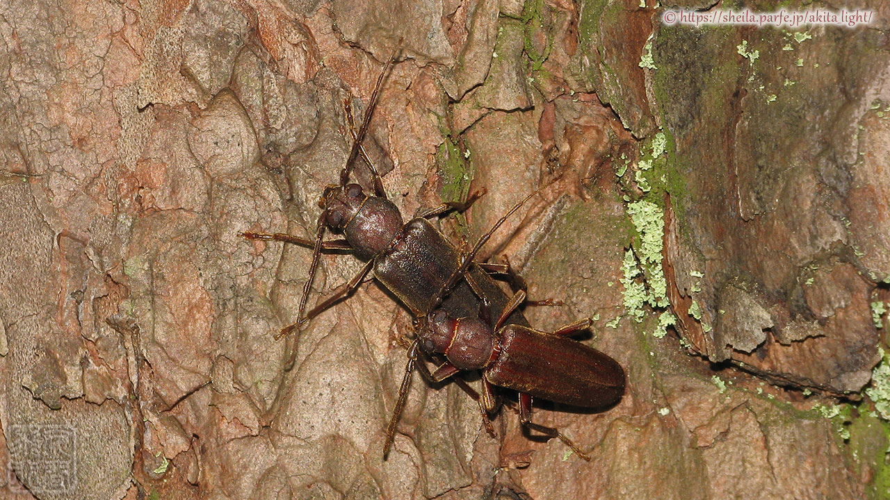 アカマツ樹幹で撮影したサビカミキリのペア。