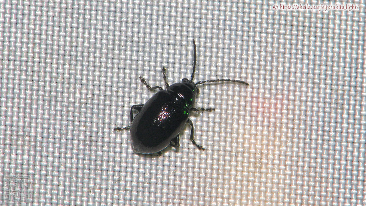 前胸背板の後縁に横溝があることからカミナリハムシの仲間と思われる。濃紺~黒の色彩で丸みを帯びた体型をしている。この属は似た種も多いため灯火飛来の個体では同定が難しい。