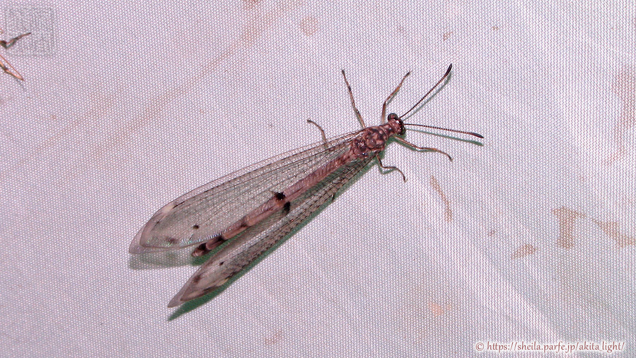 シロハラホシウスバカゲロウは♂の腹部背面がほとんど灰白色になることが和名の由来で、翅の黒斑が小さいことも特徴になる。秋田県では初夏~夏ころに発生し低標高地からブナ帯まで生息している。分布は北海道・本州・四国。この仲間のなかでは北海道まで分布する唯一の種となっている。