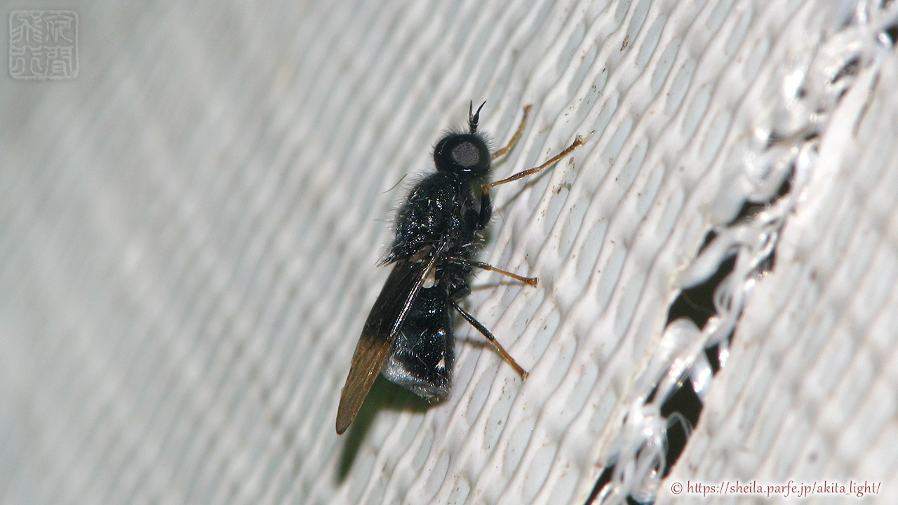 形態や翅脈からミズアブ科で調べてみたところ「Kolomania albopilosa」という種のようだ。同所では過去にも何度か飛来したことがあった。