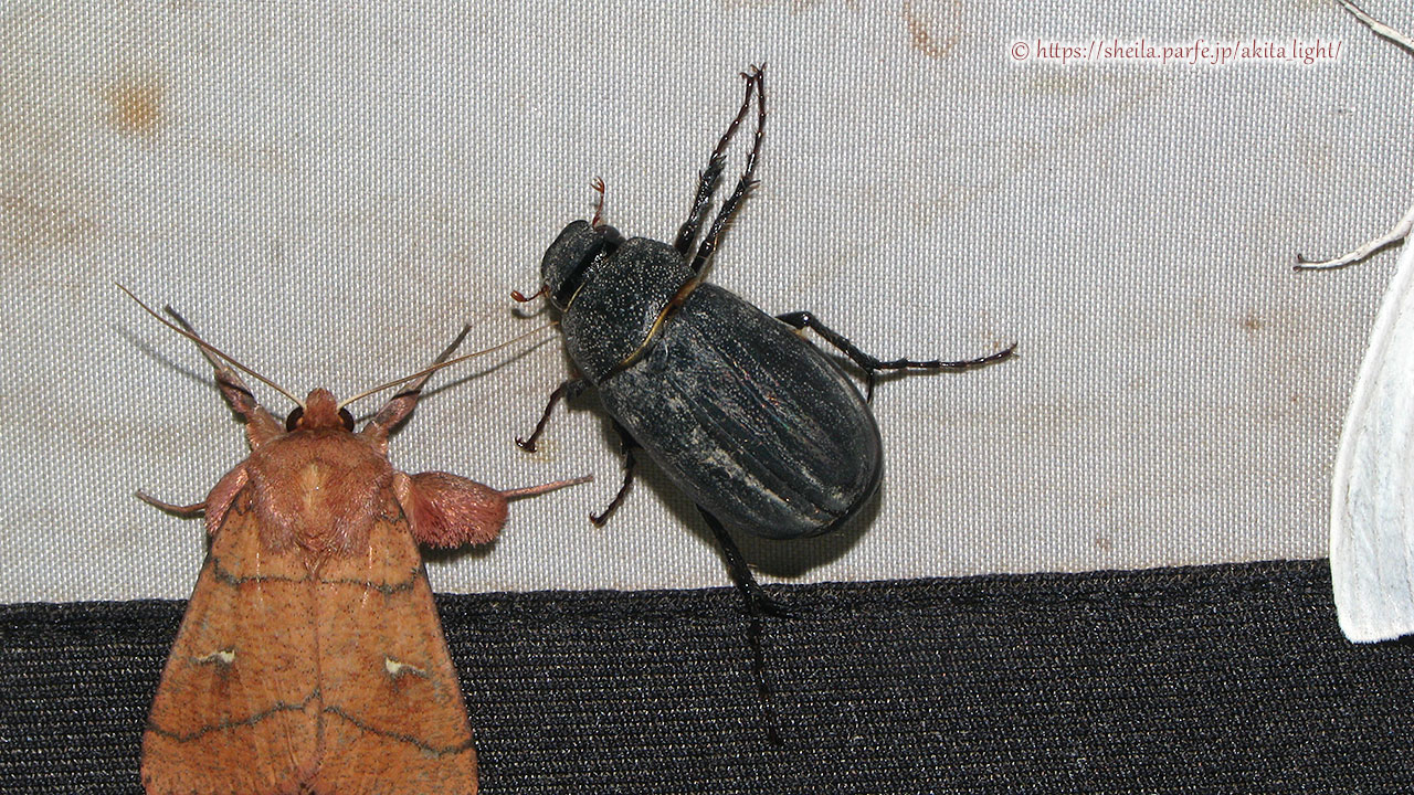 同地区でのライトトラップに飛来した個体。ここではたくさんの汚れた個体が飛来した。クロコガネ類は灯火にはめったに飛来しないがオオクロコガネはよく飛来する。