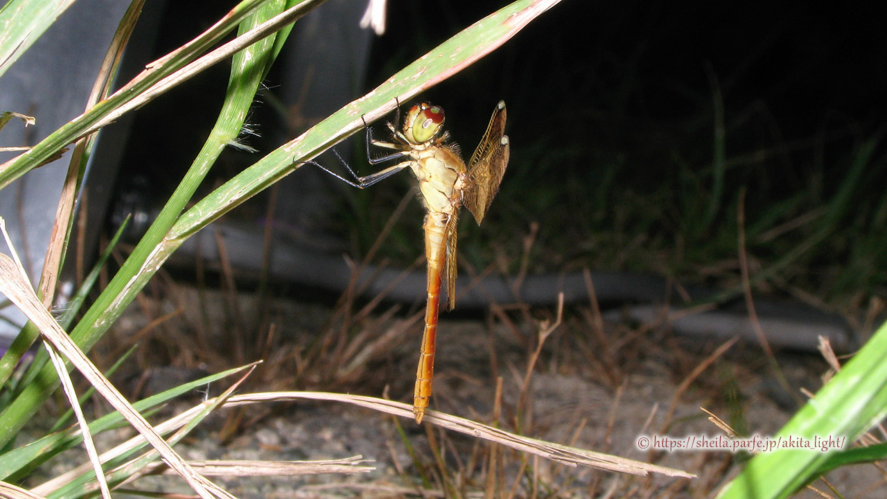 ライトトラップ下で撮影したミヤマアカネ(オス)