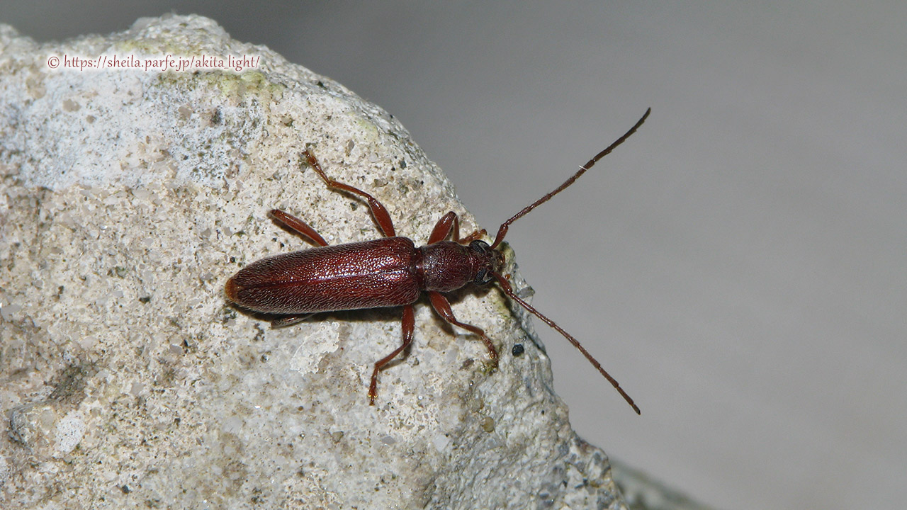 ライトトラップ下で撮影したヨコヤマヒメカミキリ(オス)