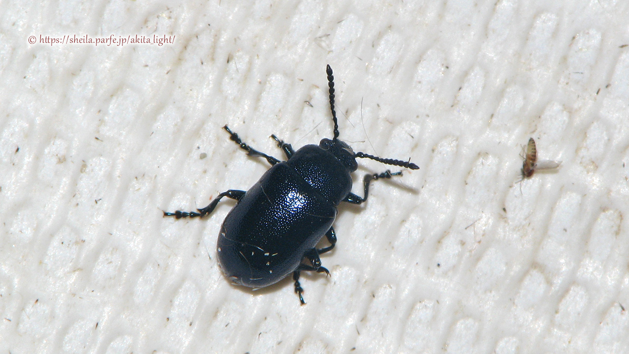 金属光沢のある瑠璃色のハムシの一種。昼行性で成虫幼虫ともギシギシ、スイバ、ダイオウなどのタデ科の葉を食べる。個体数はひじょうに多く、春~初夏にかけて牧草地のギシギシなどにたくさんの個体が群れていることがある。記憶のかぎりライトトラップには初飛来だった。