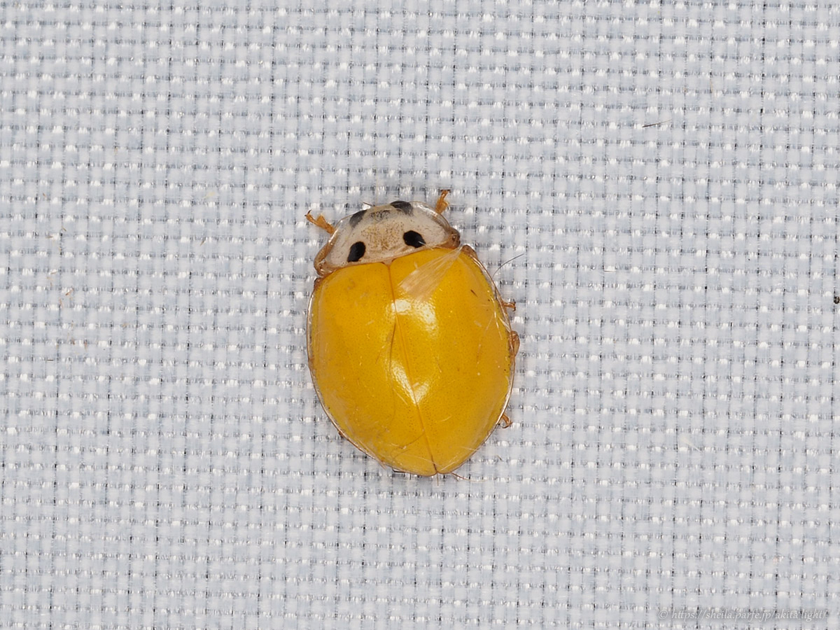 上翅が黄色一色のテントウムシ。成虫・幼虫ともに、うどんこ病などの菌類を食べる食菌性。灯火に飛来することは知っていたが、自分のライトトラップには初飛来だった。