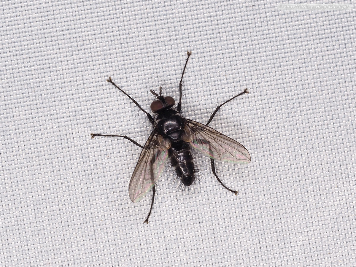 同日飛来した別の個体。腹部のかんじから別種もありうるが、♀の可能性もありそうなので掲載。この体型のほうが複数飛来していた。本種と思われるハエは晩春~初夏のライトトラップに飛来する。
