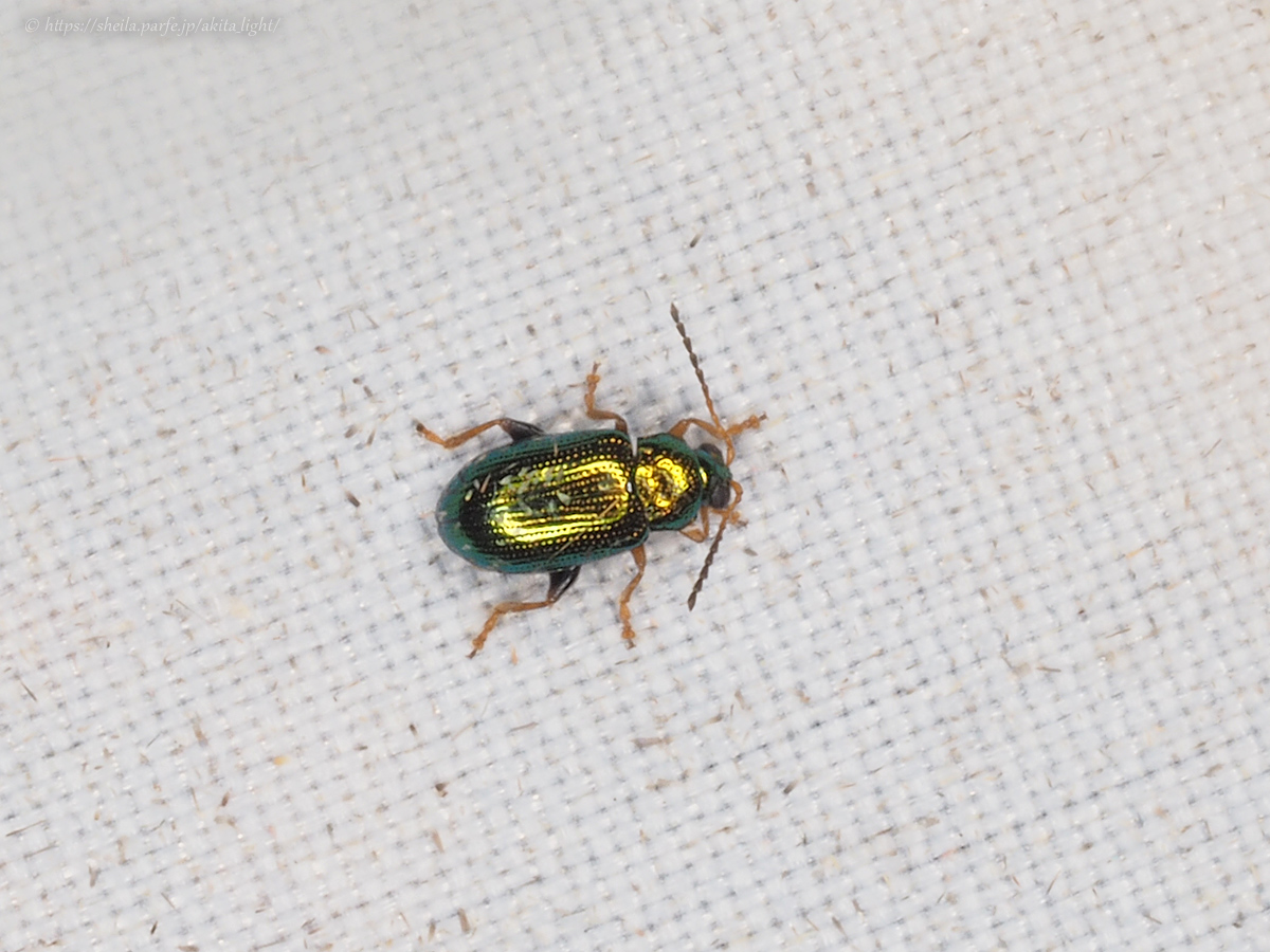 小さいながら金緑色に輝くきれいなノミハムシの一種。ヤナギ類につくようで、ヤナギの多い上流河川沿いでのライトにはよく飛来している。