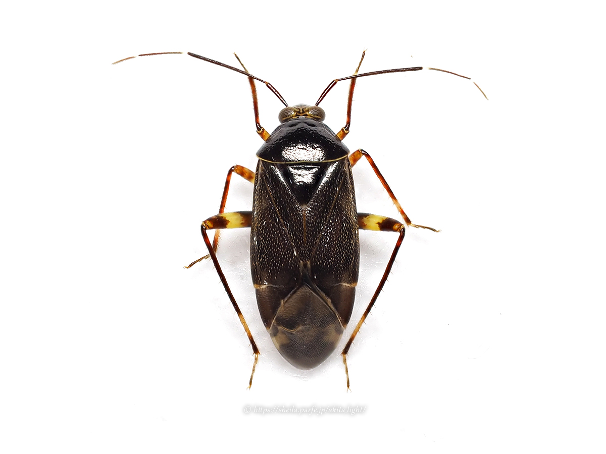 同属のツヤクロカスミカメ(P. glaber)かと思っていたが、SNSでニセツヤクロカスミカメではないかと教えていただいた。半翅鞘にある軟毛がポイントのようで、ツヤクロはほとんど毛がなくつるんとしている。