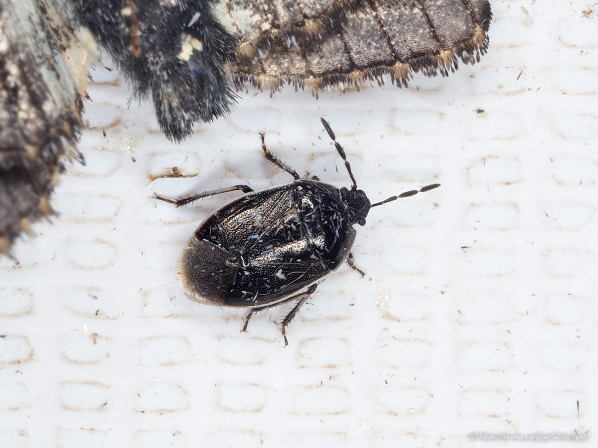 半翅鞘革質部に一対の白紋があるツチカメムシ(ミツボシツチカメムシ属)の一種。♂と♀で大きさが異なり♂は小さい。この個体は♀で、灯火には♀のみが飛来する。