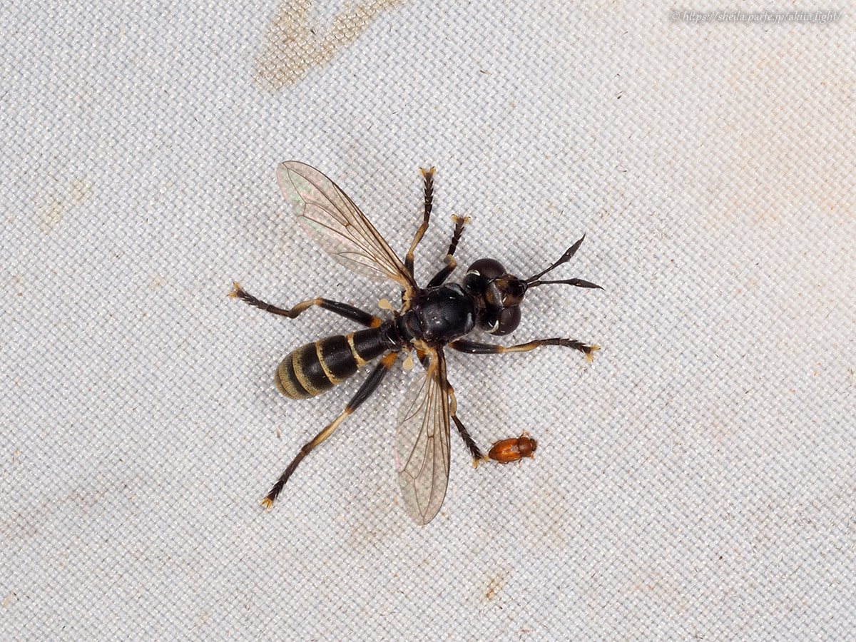 ハチに似た風貌のかっこいいメバエ科の一種。頭部や胸部の斑紋などからジョウザンメバエと思われる。山地に生息するようだ。