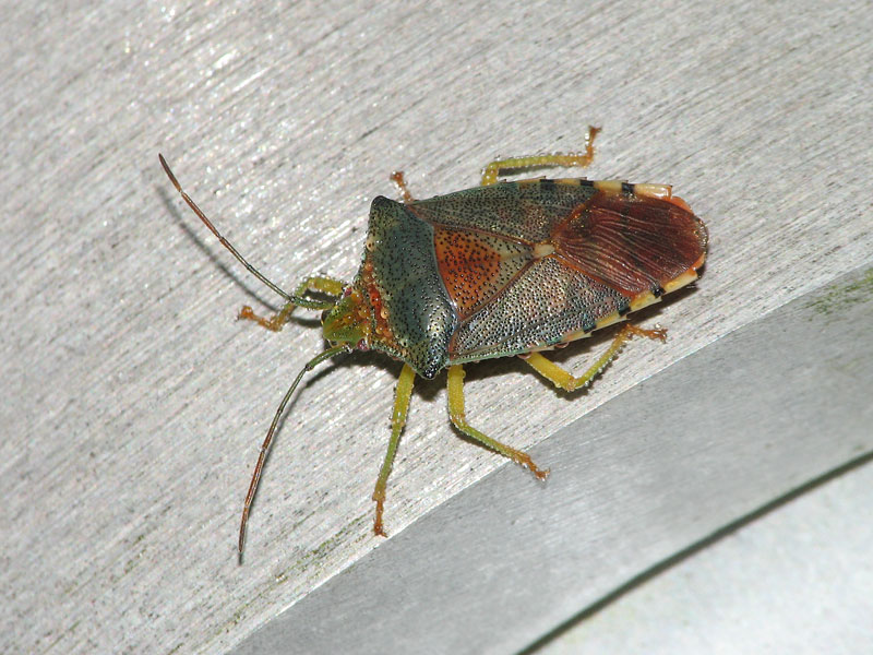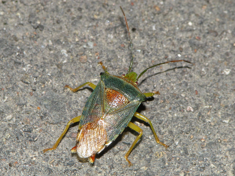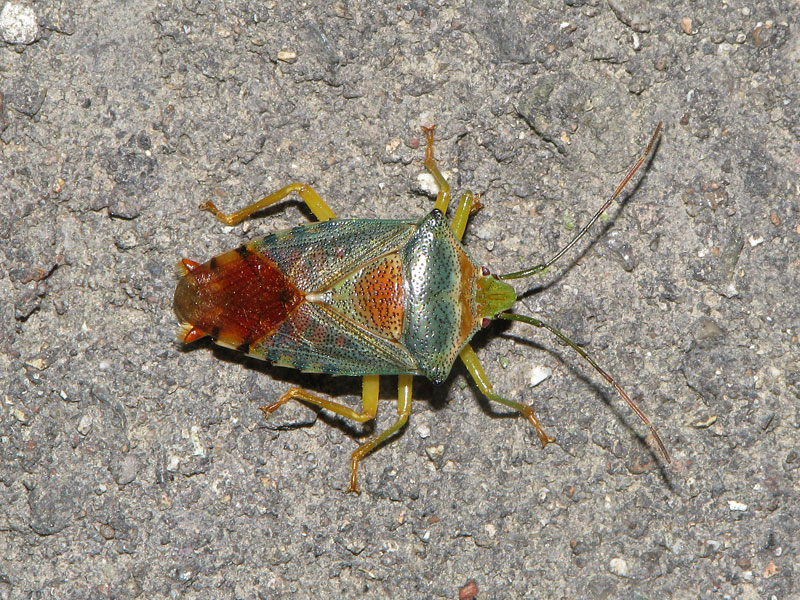 青緑色をした綺麗なカメムシ。和名の「セアカ」は小楯板が赤みを帯びることから。