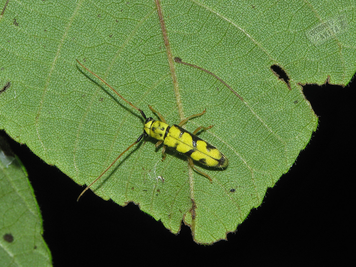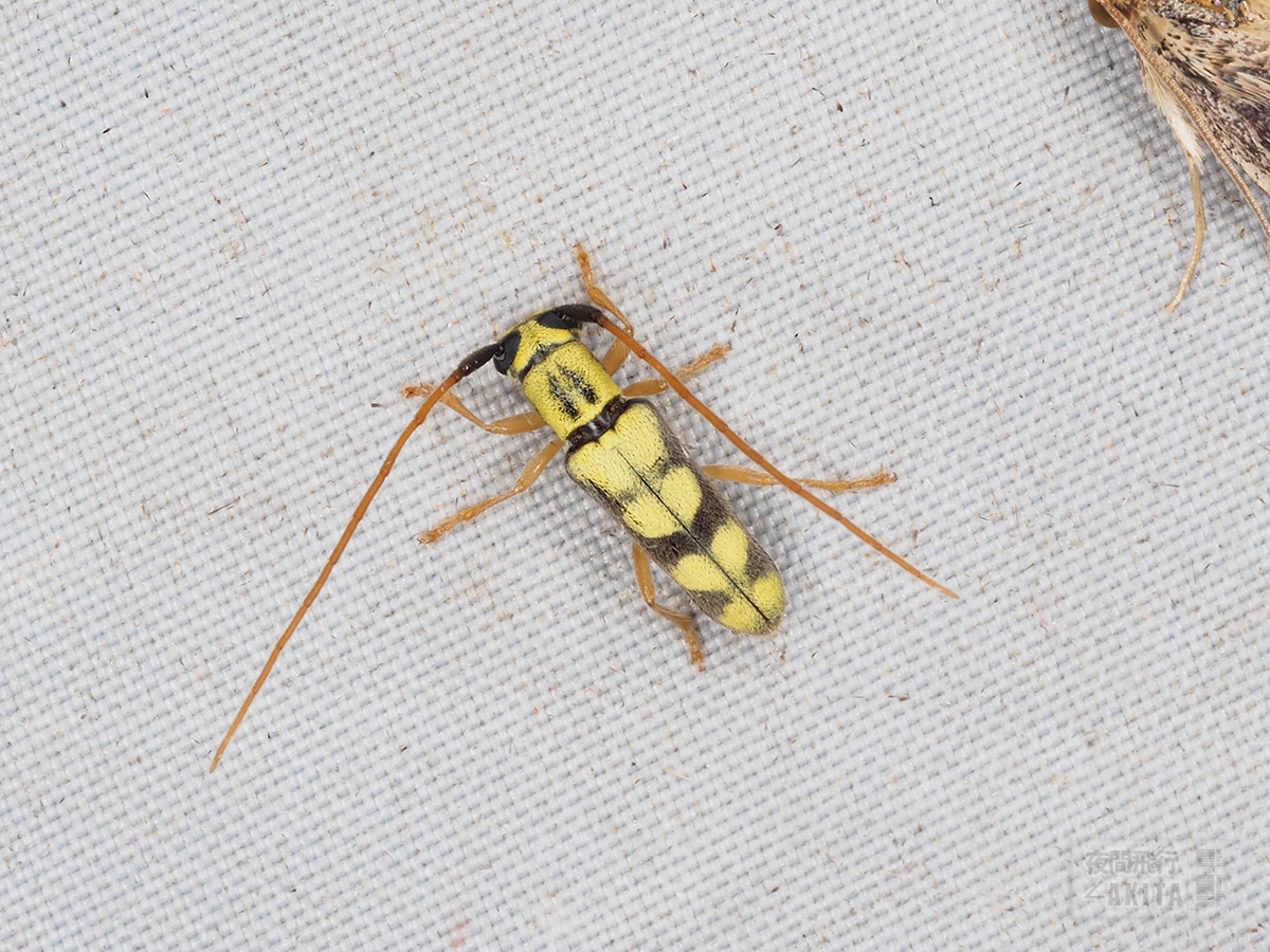 背面に大黄色紋が広がるキモンカミキリ属の一種。日中はオニグルミやサワグルミに集まり、生葉の裏から葉脈を後食する。平地~山地まで生息するが、平地~丘陵帯あたりのオニグルミが見つけやすい。ライト飛来は少ないようで自分のライトトラップには2度目の飛来だった。