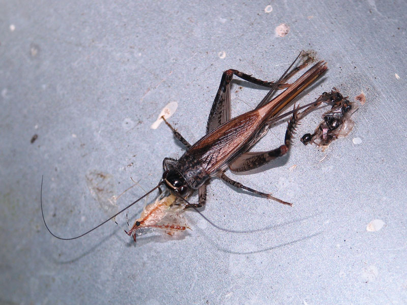 長翅タイプで少し迷ったが、全体の色彩や産卵管、顔などの特徴からモリオカメコオロギの♀が近いように思われる。