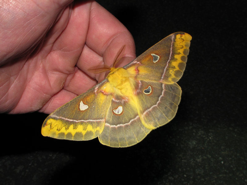 北方系の蛾で、秋に発生するヤママユガの仲間。妖艶な雰囲気の色彩とハート型の半透明窓が特徴。♂個体。