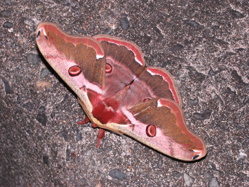 ヒメヤママユ♂個体(オリーブ褐色~茶褐色)。この個体は赤茶系の色彩だった。♀に比べると暗めの色彩になる。