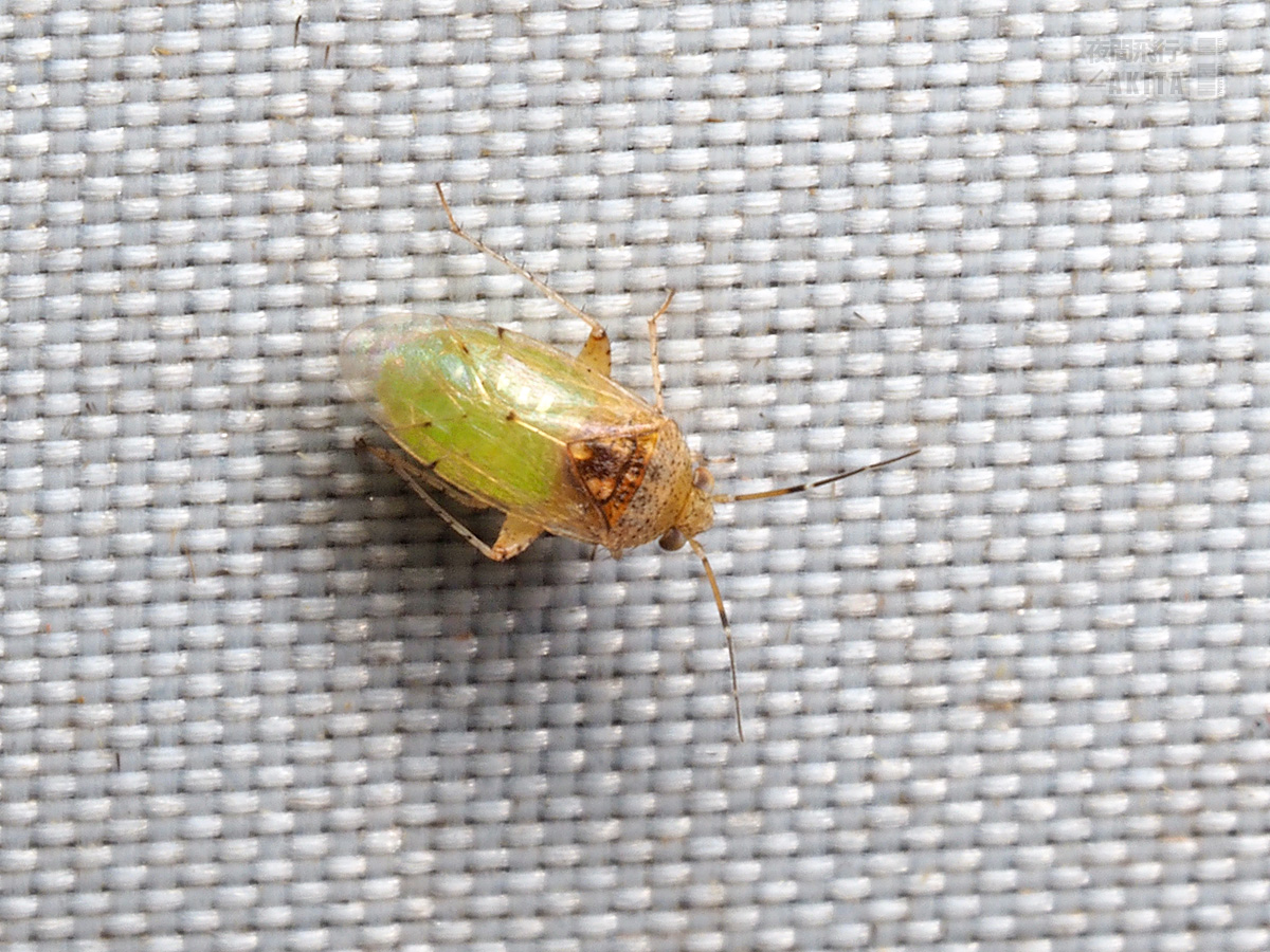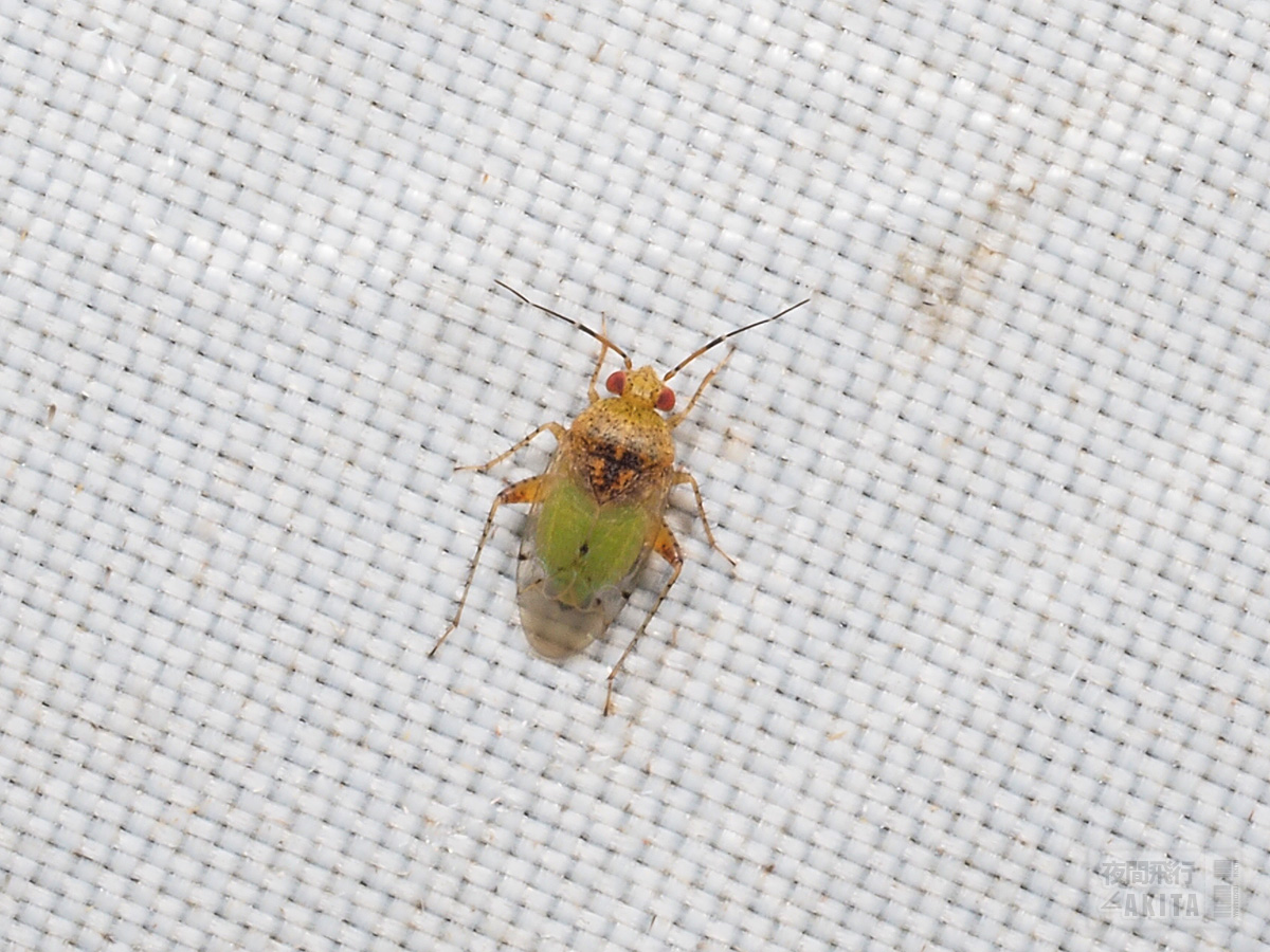 半翅鞘の大部分が透明で翅が無いかのように腹部が透けて見えている。スケバチビカスミカメと思われるが、図鑑やwebで見る個体に比べると緑色が強く暗色班が目立たない。雌雄差や個体差、あるいは別種も疑ってはみたが、ほかに該当する種は思いつかなかった。ライト以外では未見で産地は限られる印象がある。