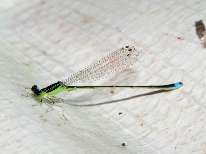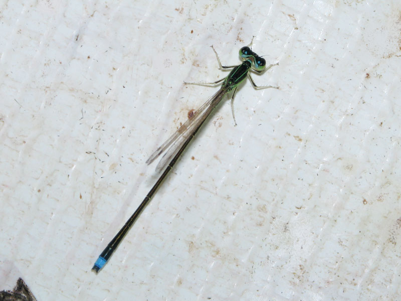 よく似ているアオモンイトトンボとは、胸部が小さいこと、♂の青色斑が第9節であること(アオモンは第8、9節)、♀の腹部第1節背面が黒いことで区別できるようだ。