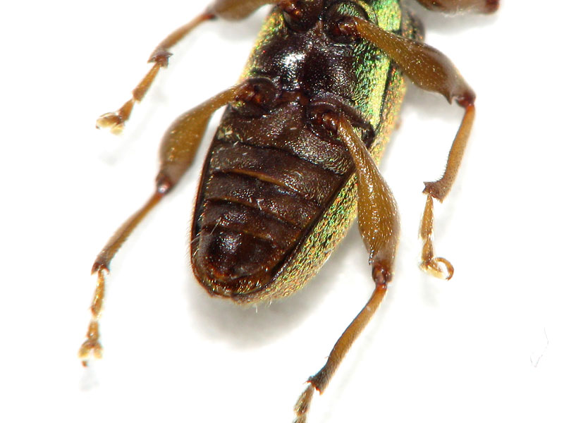 体や脚の色彩、腹部の特徴から「リンゴヒゲボソゾウムシ(リンゴヒゲナガゾウムシ)」としたが、この仲間は互いによく似ているため間違いがあるかもしれない。