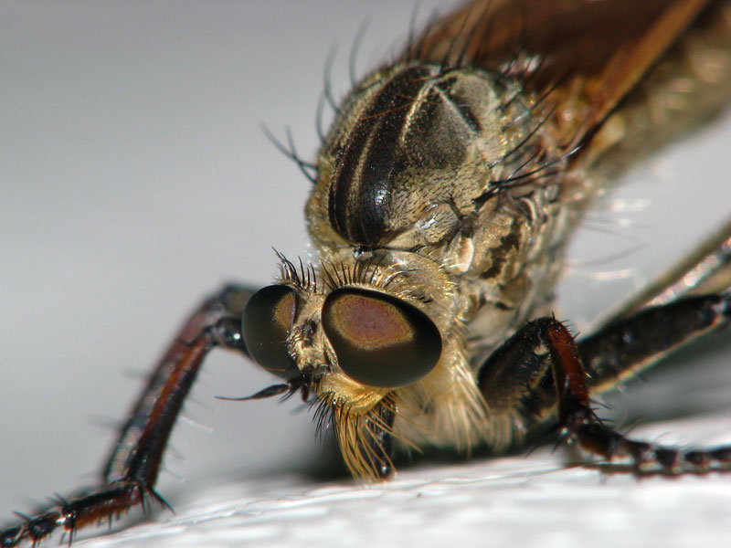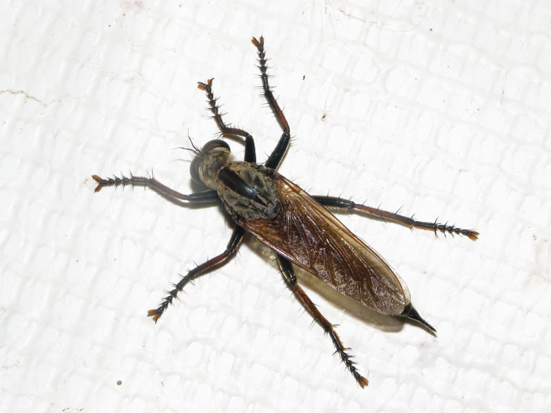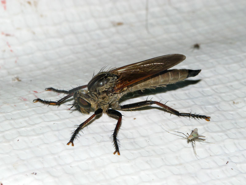 大きめのムシヒキアブが白布にとまっていた。おそらくチャイロムシヒキの♀個体と思われる。