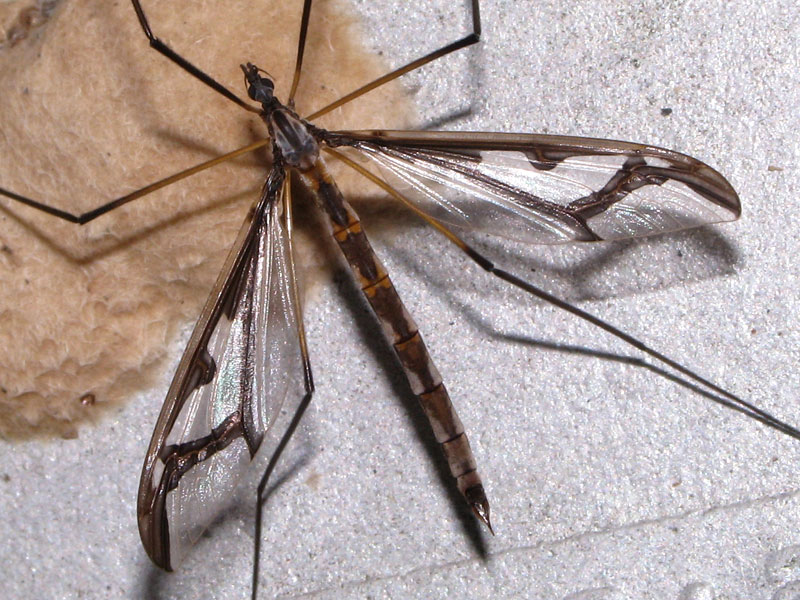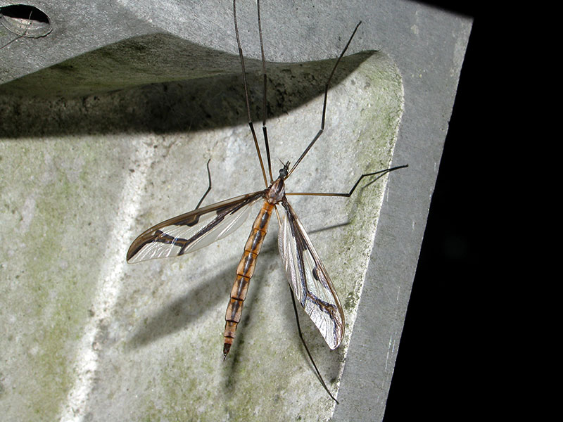 外灯下の橋欄干に、目を惹く斑紋の大きめのガガンボがとまっていた。近似種などはよくわからないがギフダイミョウガガンボと思われる。正確に計測できなかったが体長は30~40mmほどあった。
