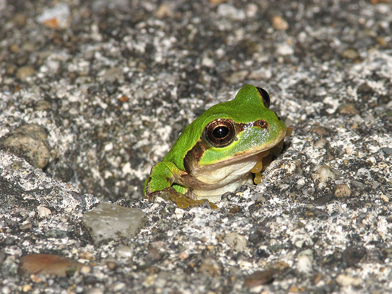 外灯下でコンクリート部分の窪みに入っていた。アマガエルは愛嬌があってかわいらしいが、皮膚の粘膜からは毒が分泌されているため、素手で触った場合は手洗いを忘れずに。(触れても問題ない程度のようではあるが、目に入ったりすると失明する危険もあるとか)。