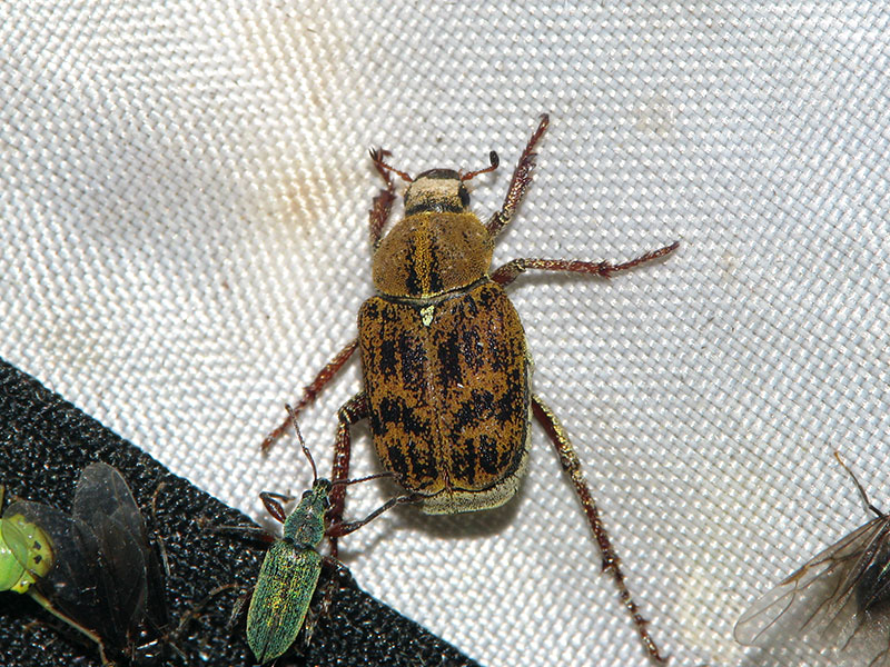 アシナガコガネ類のなかでは最も個体数の多い種で、5月~8月にかけて各種花上に見られる。幼虫は様々な植物の根を加害するようだ。背面の斑紋は個体により変異がある。基本的に昼行性のため、このように灯火に飛来した個体を目にすることは少ない。