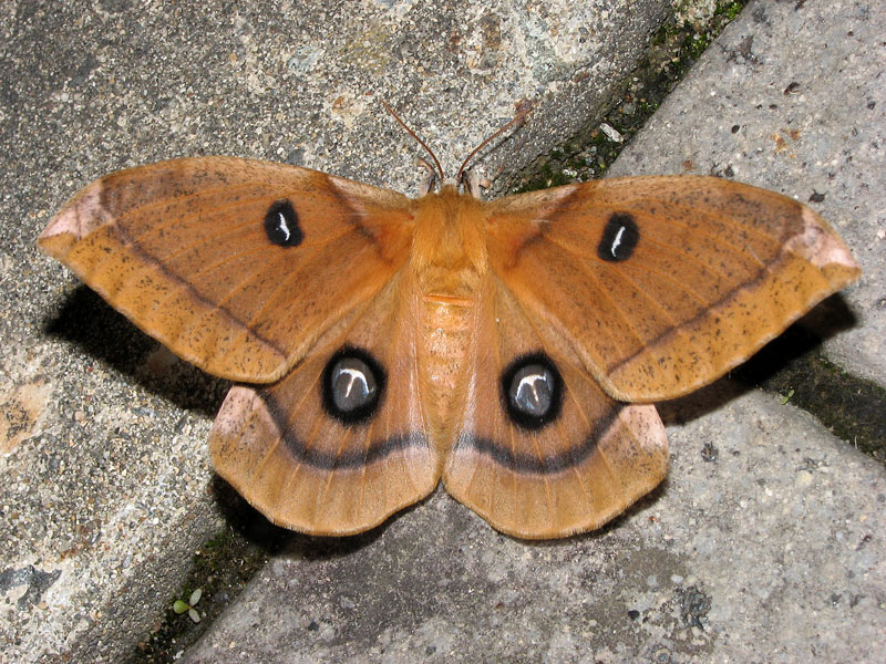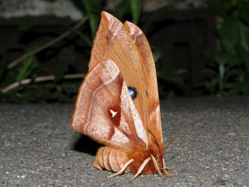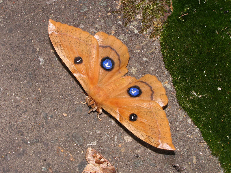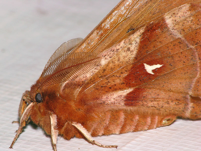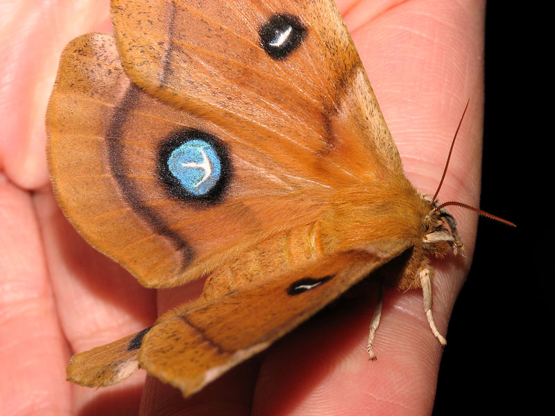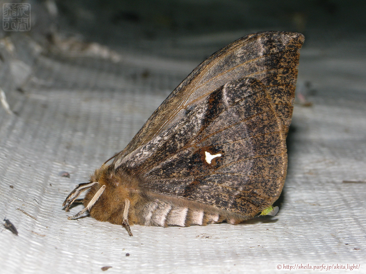ライトトラップに飛来したエゾヨツメの♀個体。平地では4月、山麓部では5月中旬ころに、ブナ帯の標高になると6月ころに見られる。眼状紋は角度によって鮮やかな青になる。