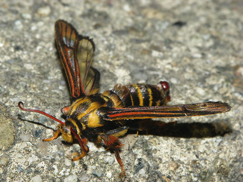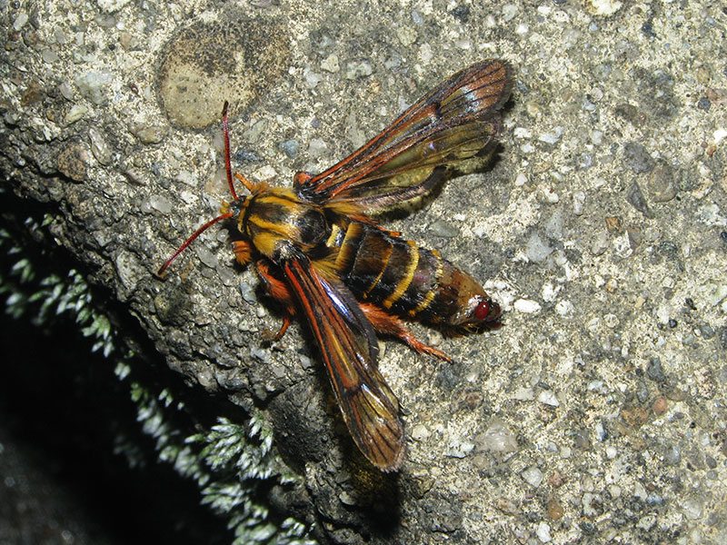 やや大型のスカシバガ科の仲間で、色彩パターンなどスズメバチ類に擬態していると思われる。この手のスカシバガは飛んでいる姿がスズメバチ類によく似ている。