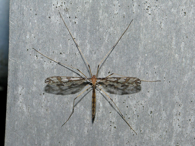 外灯下の橋欄干に綺麗なガガンボがとまっていた。翅脈や斑紋で調べていたところ「Heterangaeus gloriosus」という種が近いように思われる。捕獲しようかと思ったら飛ばれてしまった。