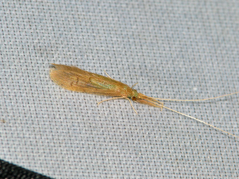 池沼付近の草原でライトをつけたら飛来した。ヒゲナガトビケラ科(クサツミトビケラ属)で長い触角をもつ。