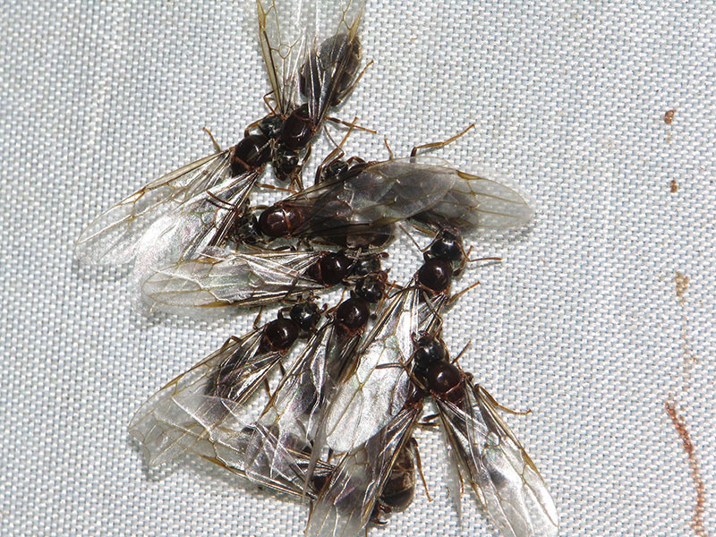 結婚飛行の時期にあたったようで、このような塊が白布にたくさんできていた。ケアリ亜属の女王なのは間違いないが、女王だけでの同定は難しいようなので「一種」とした。この属ではカワラケアリ(Lasius sakagamii)やハヤシケアリ(L.hayashi)あたりが灯火によく集まるようだ。