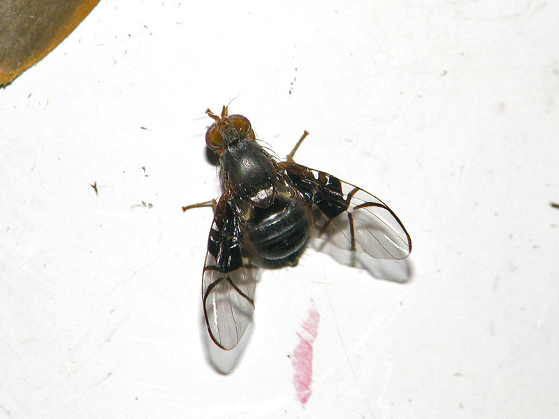 似た種が何種かあるが、翅の斑紋の微妙な違いなどから「クロハスジハマダラミバエ」とした。「クロハススジ」か「クロハスジ」か和名が二通りあり判断に困った…学名も「A.purmunda」など、ややこしい問題があるようだ。