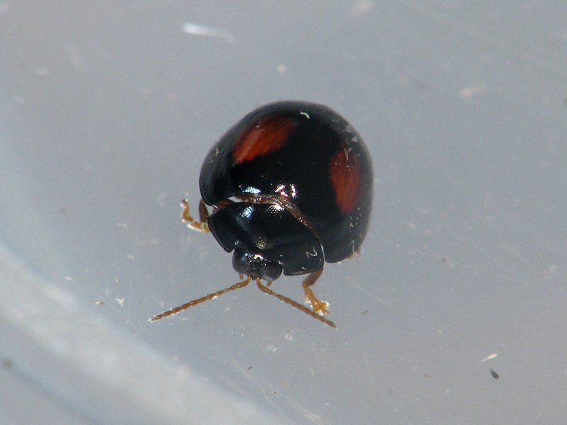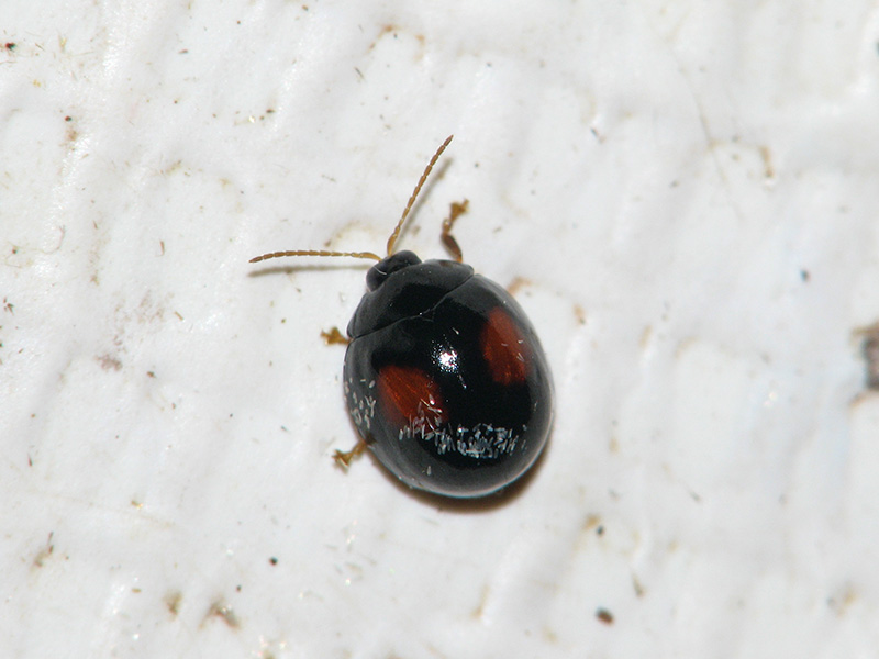 アカホシテントウにそっくりなノミハムシが飛来した。前胸背の形状などからヘリグロテントウノミハムシ(分布:本州、四国、九州、小笠原諸島、琉球)としたが、よく似た種にテントウノミハムシ(A. biplagiatus)がおり、分布(北海道~四国、九州)などはこちらがしっくりくる…。