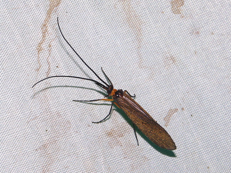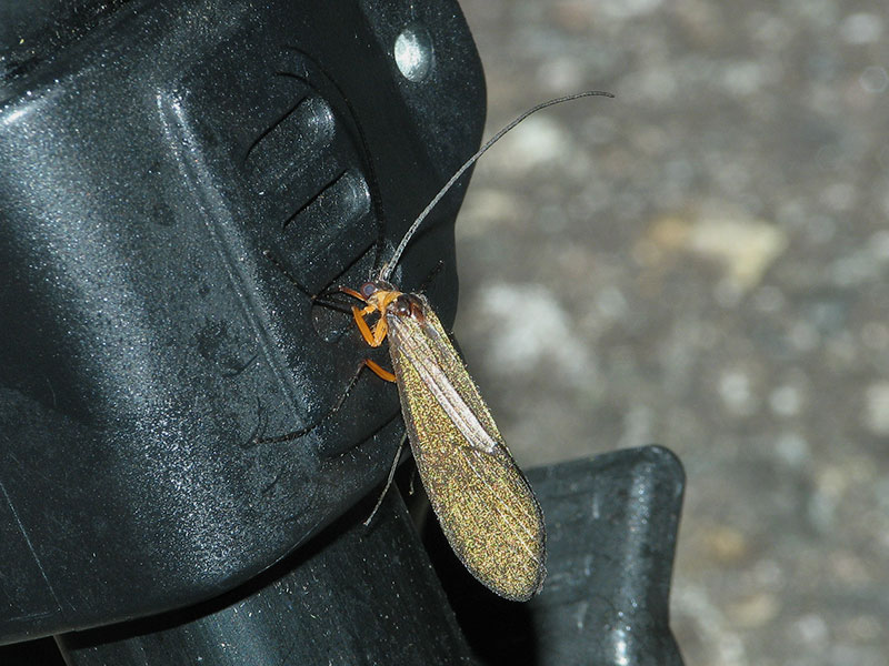 ホタルトビケラ属の仲間は互いによく似ており同定は難しいが、前・中脚の脛節と全フ節が黒色になることで「ヤマガタトビイロトビケラ」に落ちるようだ。♂個体だったため交尾器も確認した。灯火へは秋口にときどき飛来する。