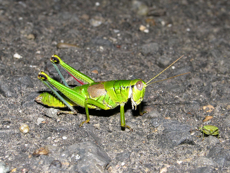 飛来というよりはジャンプしながら歩来したものと思われる。翅は短く丸い。北海道、東北~近畿(東北南部以東では日本海側)に分布、やや湿った林緑に生息する。成虫の発生期は7月~10月。